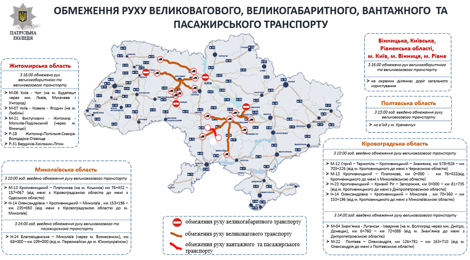 В связи с осложнением погодных условий, в целях предотвращения заторов, в ряде областей ограничено движение для проезда тяжеловесных грузовых и пассажирских транспортных средств. Список приводит патрульная полиция Украины.