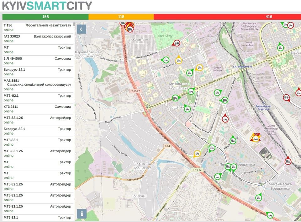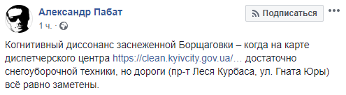 И что, несмотря на то, что судя по карте диспетчерского центра на заснеженной Борщаговке достаточно снегоуборочной техники, но дороги (пр-т Леся Курбаса, ул. Гната Юры) всё равно заметены.