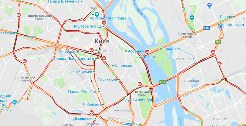 В конце рабочего дня, по состоянию на 17:30, в Киеве вновь образовались пробки в 9 баллов. , в районе станции метро Университет, на Крещатике, в районе Майдана. Загружены бульвар Леси Украинки, проспект Степана Бандеры, бульвар Дружбы Народов. А также на Харьковском шоссе, Броварском проспекте.