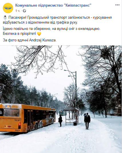 Утром в среду, 23 января, сильнейший снегопад в Киеве спровоцировал не только пробки на дорогах, но и отклонения от расписания движения общественного транспорта столицы. Об этом сообщает пресс-служба "Киевпастранса" на странице в Facebook.