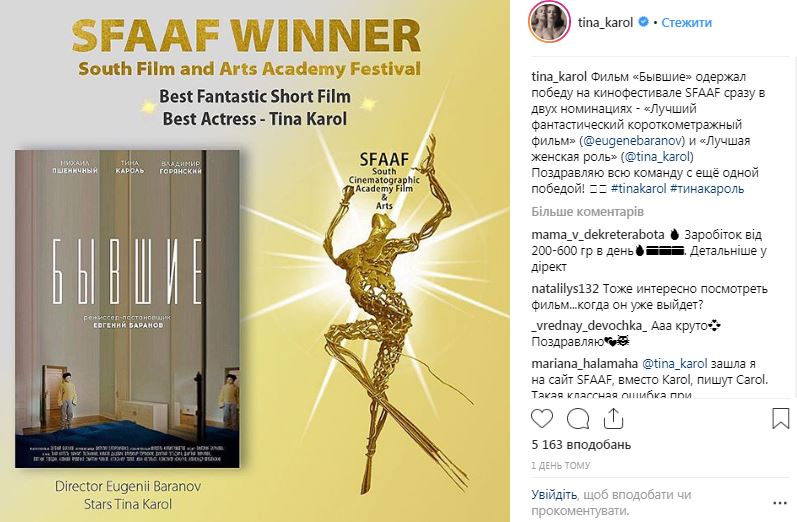 "Фильм "Бывшие" одержал победу на кинофестивале SFAAF сразу в двух номинациях. Поздравляю всю команду с еще одной победой! – написала Тина Кароль. За мастерское воплощение непростой истории молодой женщины Тина Кароль получила награду кинофестиваля SFAAF в номинации "Лучшая женская роль". Кроме этого, награду получил и режиссер киноленты Евгений Баранов.