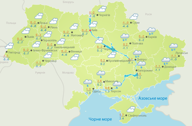 Погода 27 января. Небольшие осадки в Днепре, Харькове, Полтаве и Запорожье, а также на юге страны Фото: meteo.gov.ua