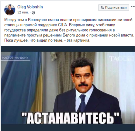 "Между тем в Венесуэле смена власти при широком ликовании жителей столицы и прямой поддержке США. Впервые вижу, чтоб главу государства определяли даже без ритуального голосования в парламенте простым решением Белого дома о признании новой власти. Пока лучшее, что видел по теме, - эта картинка", - написал он и прикрепил картинку с Мадуро со словом "Астанавитесь", которые ранее произнес Виктор Янукович.
