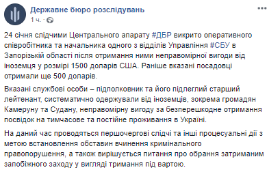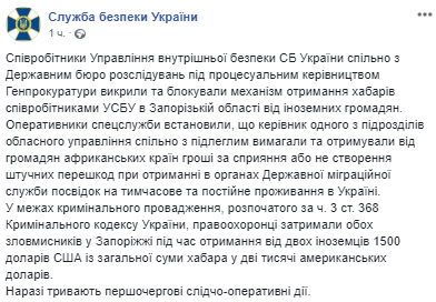 Отмечается, что сотрудники управления внутренней безопасности СБУ и ГБР "блокировали механизм получения взяток сотрудниками УСБУ в Запорожской области от иностранных граждан".