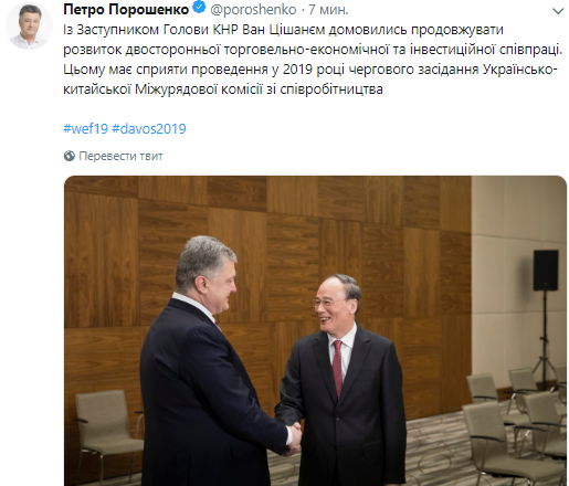 24 января Петр Порошенко встретился с заместителем председателя КНР Ван Цишанем договорились продолжать развитие двустороннего торгово-экономического и инвестиционного сотрудничества. Этому должно способствовать проведение в 2019 году очередного заседания Украинской-китайской Межправительственной комиссии по сотрудничеству", - говорится в Twitter президента.