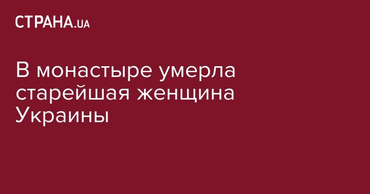 В возрасте 107 лет скончалась старейшая женщина и одновременно самая старая схимонахиня Украины, которая проживала в Женском ставропигиальном монастыре в честь Афонской иконы Божьей матери в урочище Кипячее Малинского района Житомирской области. Об этом в четверг, 24 января, сообщил ее внук - отец Роман Барановский (Роман Лилия) в Facebook.