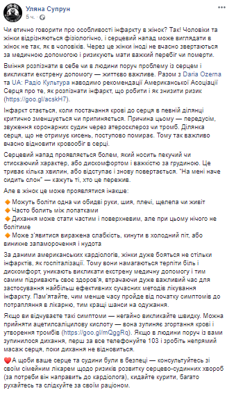 "По данным американских кардиологов, женщины очень боятся не столько инфарктов, как госпитализации. Поэтому они пытаются терпеть боль и дискомфорт, избегают вызвать экстренную медицинскую помощь и тем самым подрывают свое здоровье, теряя очень важное время для применения наиболее эффективных современных методов лечения инфаркта. Помните, чем меньше времени пройдет от начала симптомов до попадания в больницу, тем лучше шансы на выздоровление", - предостерегает глава МОЗ.