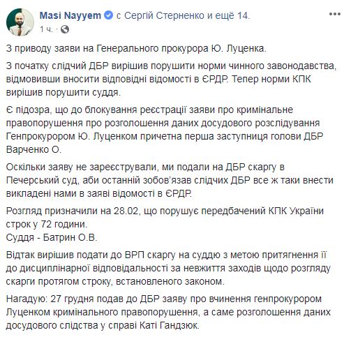 После этого адвокаты обратились в Печерский суд, чтобы обязать следователей ГБР все же внести изложенные сведения о генпрокуроре в ЕРДР.  Найем отмечает, что суд нарушает нормы УПК, поскольку судья Батрин Олеся назначила рассмотрение жалобы на 28.02.2019, что нарушает предусмотренный законом срок в 72 часа. "Есть подозрение, что к блокированию регистрации заявления об уголовном правонарушении о разглашении данных предварительного расследования генпрокурором Луценко причастна первая заместитель председателя ГБР Оксана Варченко", - написал он.