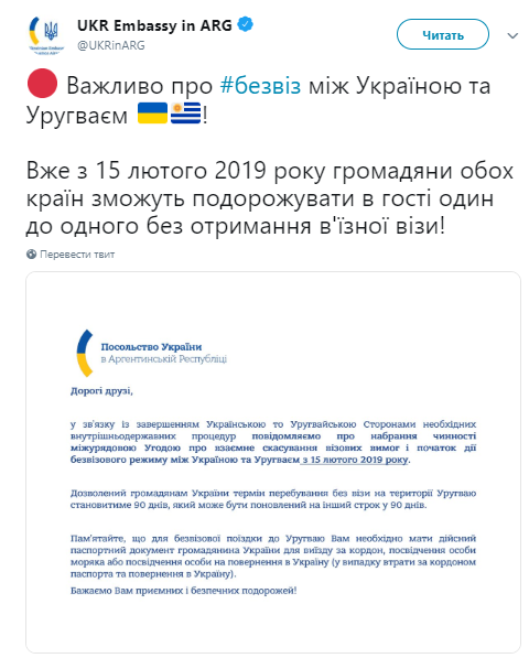 Посольство Украины в Аргентине сообщает, что безвизовый режим с Уругваем начнет действовать с 15 февраля. Об этом дипломатическое ведомство написало в своем микроблоге в Тwitter.