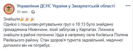 Отметим, что спасатели получили информацию о том, что лыжник из Германии 1971 года рождения заблудился в Раховском районе на горе Драгобрат еще в 19:45 24 января. С тех пор продолжалась спасательная операция. И уже в 18:13 25 января ГСЧС сообщила о том, что туриста нашли в районе Урды. Состояние его здоровья оценивается как удовлетворительное, медпомощь ему не нужна.
