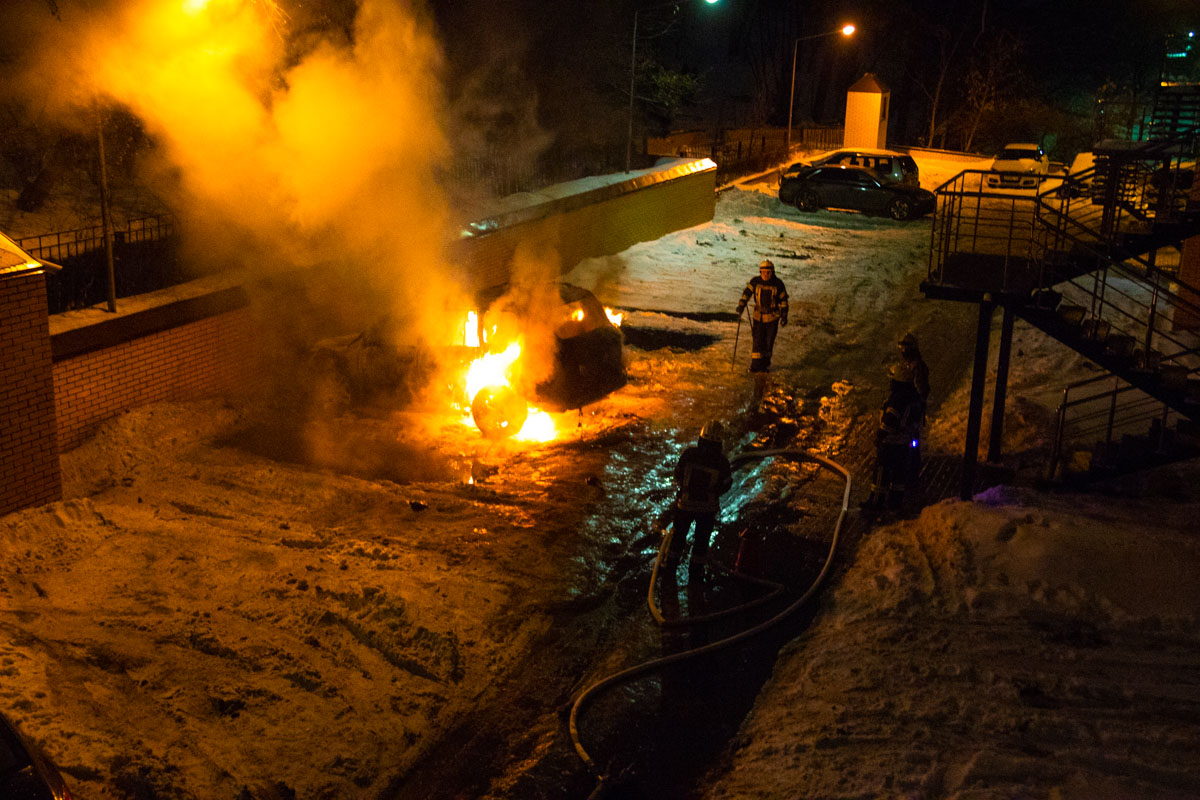 Пожар произошел на Печерске на улице Анри Барбюса 5в после двух ночи. Когда спасатели прибыли на место пожара машина уже была объята огнем.