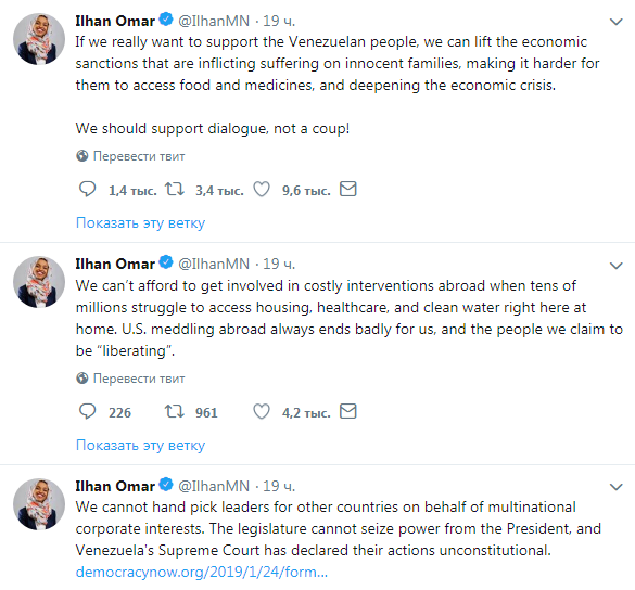 Член палаты представителей от Демократической партии Ильхан Омар также выступила против позиции США по Венесуэле.
