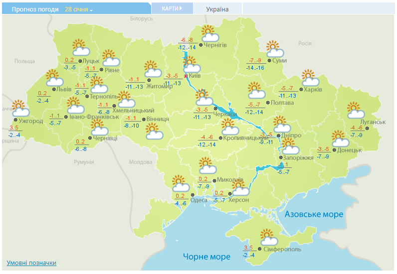 В Киеве 28 января будет без осадков. Температура ночью 11-13, днем 2-4 ниже ноля.