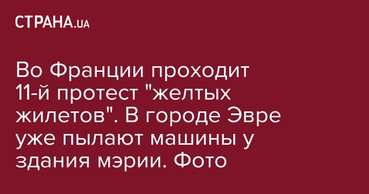 Сегодня, 26 января, во французском городе Эвре, который находится в 96 км к западу от Парижа, проходит очередная акция "желтых жилетов". Возле местной мэрии уже подожгли автомобили. Об этом сообщает Infos Françaises.