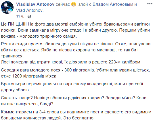 В Украине браконьеры устроили незаконную охоту на лосей, убив беременную самку и молодого вожака стада. Об этом сообщил журналист Владислав Антонов на своей странице в Facebook. При этом он не уточнил, где именно были убиты животные.