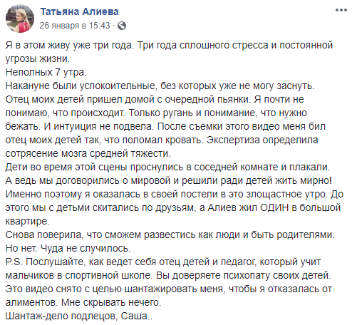 Бывшая жена экс-полузащитника киевского Динамо Александра Алиева Татьяна сообщила в Facebook, что он ее снова избил, когда пришел домой пьяный.