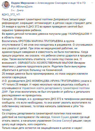 "Во время детской потасовки девочка получила удар!!! Карандашом!!! в область глаза", - уточняется в сообщении.