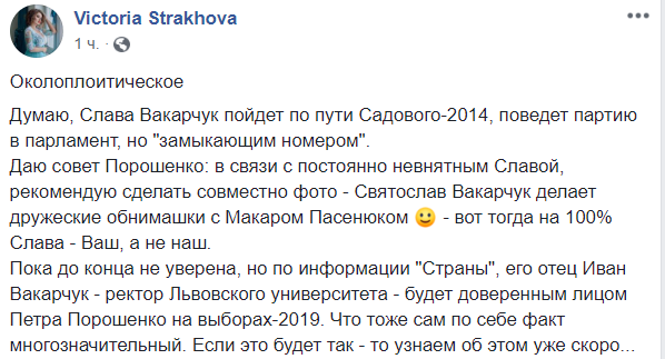 Даю совет Порошенко: в связи с постоянно невнятным Славой, рекомендую сделать совместно фото - Святослав Вакарчук делает дружеские обнимашки с Макаром Пасенюком :) - вот тогда на 100% Слава - Ваш, а не наш", - пишет банковский аналитик Виктория Страхова.