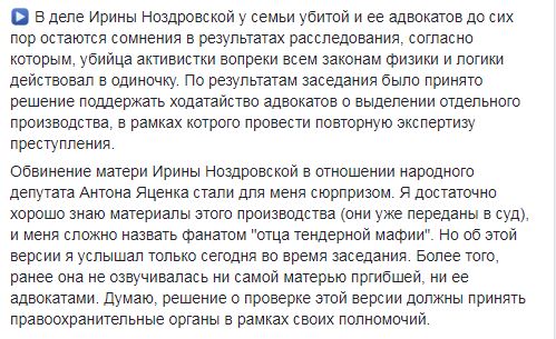 "Обвинение матери Ирины Ноздровской в отношении народного депутата Антона Яценка стали для меня сюрпризом", - написал он. По словам нардепа, он хорошо знает материалы этого производства, но об этой версии услышал только в понедельник во время заседания ВСК. Найем пишет, что ранее такую версию не озвучивали ни родственники погибшей, ни ее адвокатами. "Думаю, решение о проверке этой версии должны принять правоохранительные органы в рамках своих полномочий", - сообщил нардеп.