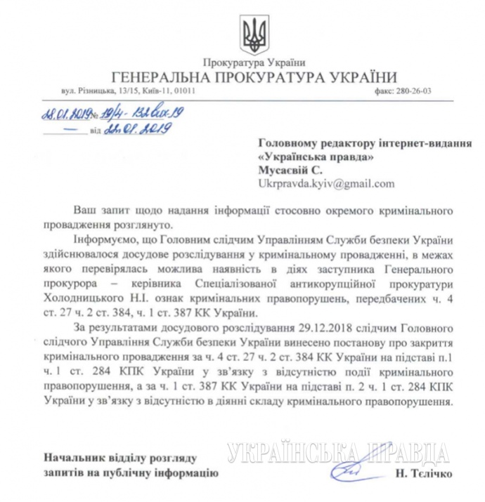 В СБУ закрыли уголовное производство против главы Специализированной антикоррупционной прокуратуры (САП) Назара Холодницкого по подозрению в разглашении сведений предварительного расследования закрыто.
