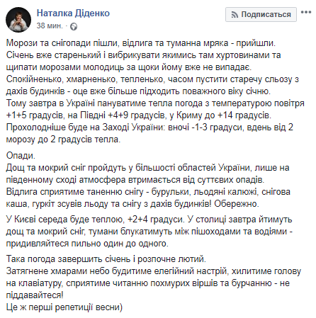 "Такая погода завершит январь и начнет февраль. Затянутое облаками небо будет будить элегическое настроение, клонить голову на клавиатуру, способствовать чтению мрачных стихов и ворчанию - не поддавайтесь! Это же первые репетиции весны", - написала Наталья Диденко.