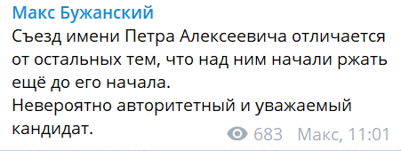 "Съезд имени Петра Алексеевича отличается от остальных тем, что над ним начали ржать ещё до его начала. Невероятно авторитетный и уважаемый кандидат", - пишет блогер Макс Бужанский.
