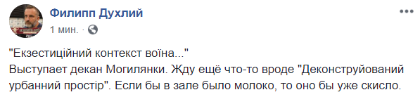 "Екзестиційний контекст воїна..." Выступает декан Могилянки. Жду ещё что-то вроде "Деконструйований урбанний простір". Если бы в зале было молоко, то оно бы уже скисло", - пишет Филипп Духлий.