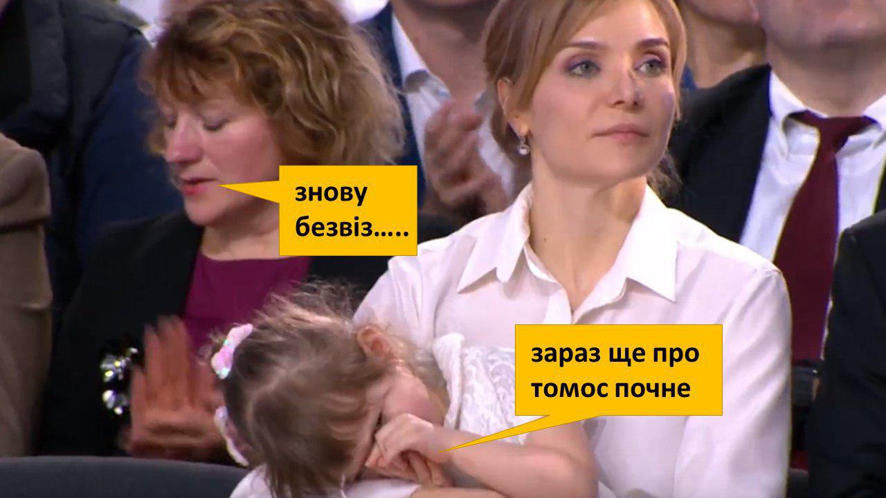 Полный зал военных, творческих людей и молодежи. В первых рядах сидит Епифаний. У всех просветленные и счастливые лица. Страна на гребне своего благополучия и славы. Неважно, что старики еле выживают, что в стране эпидемии, что военные по-прежнему питаются чем попало, а в больницах на койках лежат по двое. Скажите мне, может существует несколько Украин?", - пишет блогерша Оксана Ксантопулос.
