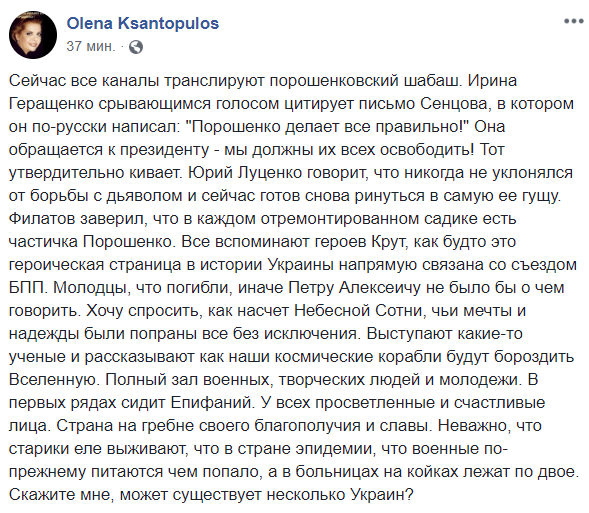 "Сейчас все каналы транслируют порошенковский шабаш. Ирина Геращенко срывающимся голосом цитирует письмо Сенцова, в котором он по-русски написал: "Порошенко делает все правильно!" Она обращается к президенту - мы должны их всех освободить! Тот утвердительно кивает.
