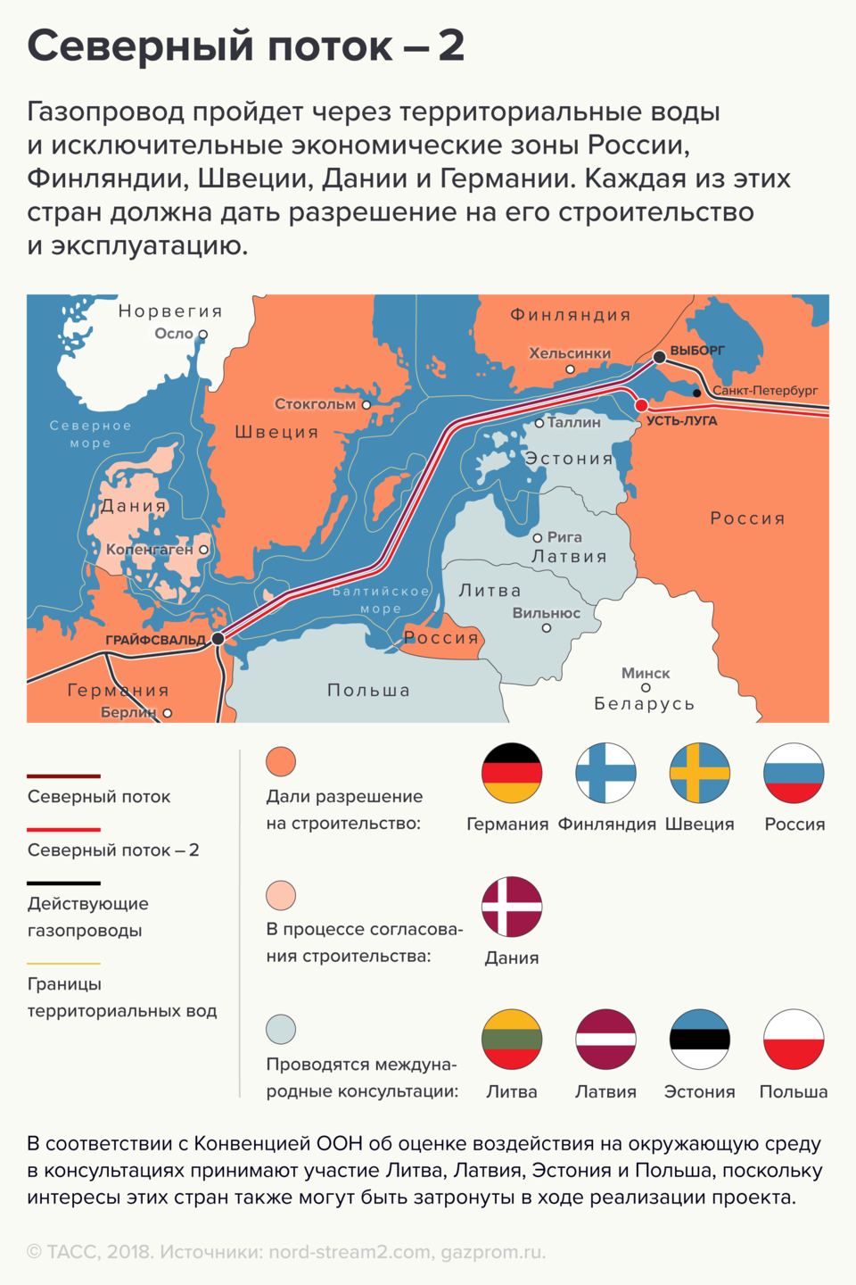 Он пройдет через исключительные экономические зоны и территориальные воды пяти стран - России, Финляндии, Швеции, Дании и Германии. Свое согласие на строительство не дала только Дания, которая планирует заблокировать или отложить реализацию проекта. Оператор проекта уже подал заявку на альтернативный маршрут газопровода, который пройдет через исключительную экономическую зону Дании к северо-западу от острова Борнхольм.