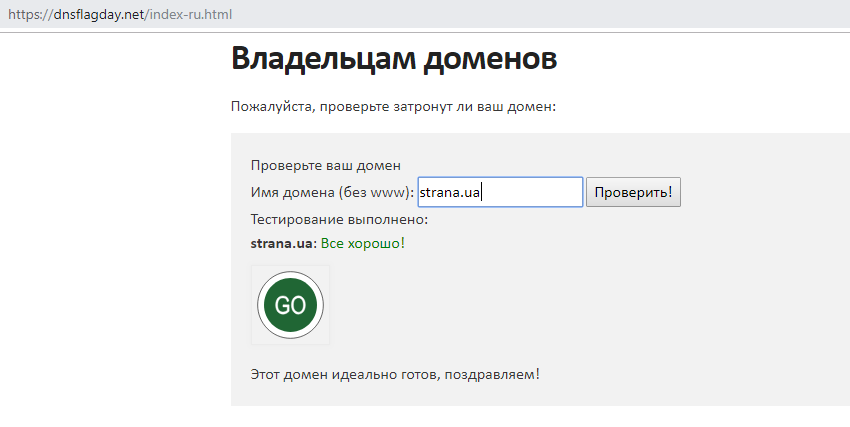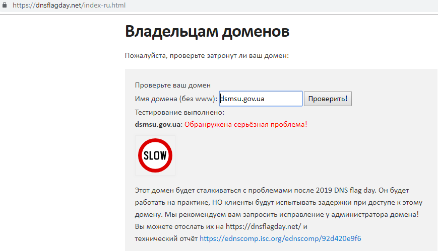 Чтобы узнать, поддерживает ли ваш ресурс EDNS, можно пройти быструю проверку на сайте DNS flag day: в специальное поле необходимо ввести адрес.