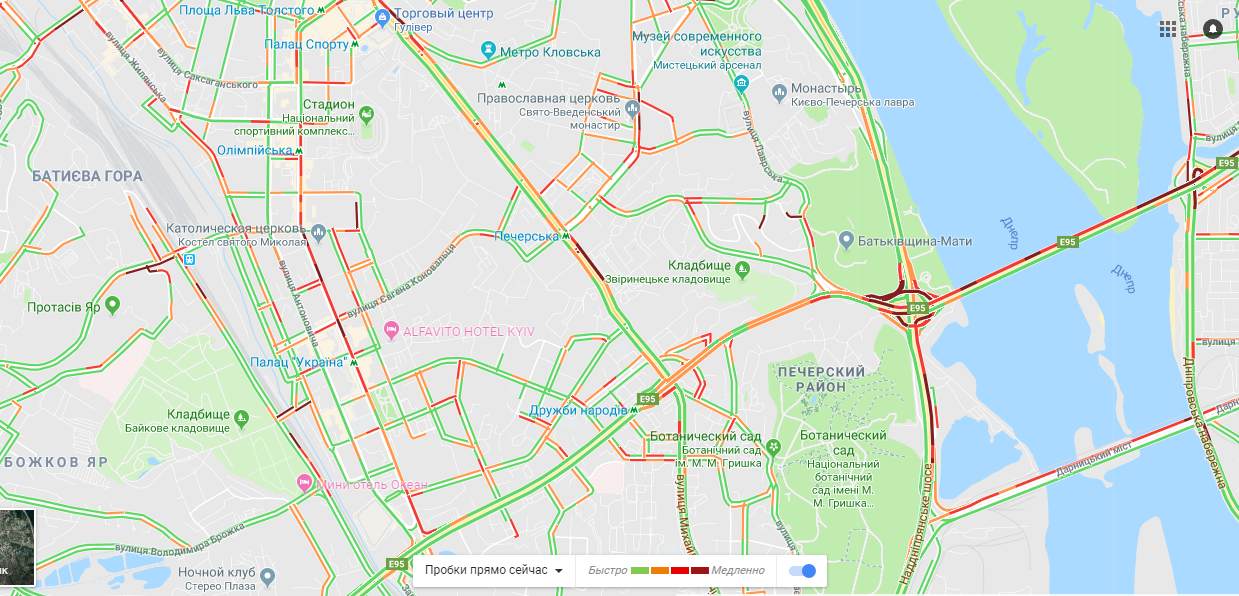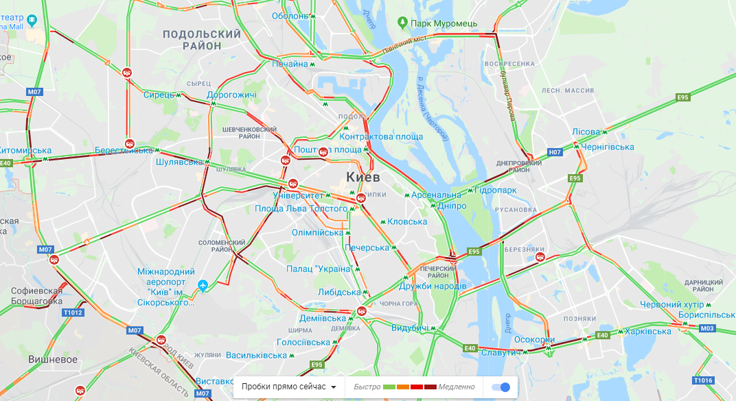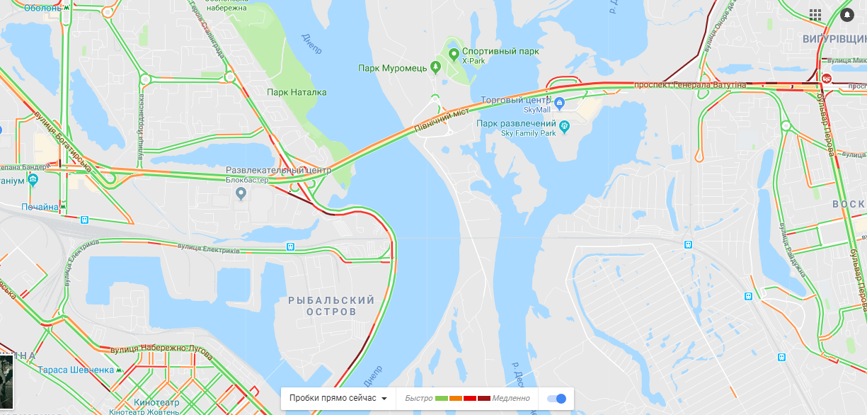 Стоят мосты: Южный, Дарницкий, Потона. Труднее всего проехать в сторону центра Киева. На Набережно-Рыбальской и Набережно-Крещатицкой улицах также образовались пробки. Машины стоят и на Броварском проспекте.
