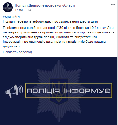 "Сообщение поступило в полицию 30 января около 10.00. Для проверки помещений и прилегающей к школам территорий на место выехала следственно-оперативная группа полиции, кинологи и взрывотехники. Информация об эвакуации школьников и работников будет предоставлена дополнительно", - сообщает пресс-служба полиции Днепропетровской области.