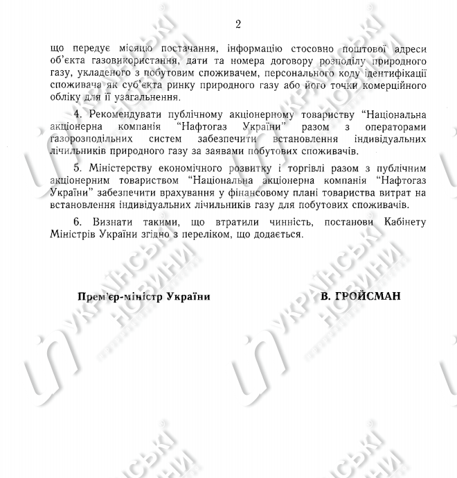 Кабмин рекомендовал НАК "Нафтогаз Украины" совместно с операторами газораспределительных сетей обеспечить установление индивидуальных счетчиков газа по заявлениям бытовых потребителей. Также правительство поручило Минэкономики совместно с "Нафтогазом" обеспечить учет в финплане НАК затрат на установление индивидуальных счетчиков газа для бытовых потребителей.
