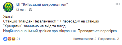 Из-за сообщения о минировании в подземке для проведения проверки закрыли на вход и выход станцию "Майдан Незалежности" и пересадку на станцию "Хрещатик". Сообщение об этом появилось около 10:20.