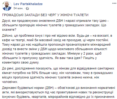 "Постоянные очереди в женские туалеты в общественных местах - банальная проблема, которая знакома всем. Везде - на вокзале, в кафе или театре, какое бы массовое мероприятие не проходило, эти очереди всегда есть. Поэтому сейчас поступило предложение проанализировать международный опыт и внести изменения в ГСН относительно возможного увеличения пропорции женских туалетов в общественных заведениях. Минимум в 2 раза, чтобы увеличить их пропускную способность", - написал Лев Парцхаладзе.