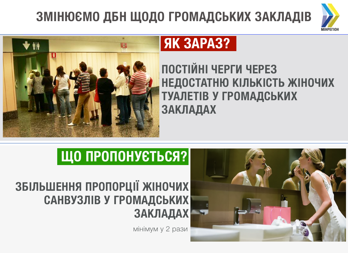 При проектировании зданий общественных заведений в Украине могут увеличить количество женских туалетов. В Минрегион рассматривают целесообразность внесения соответствующих изменений в государственные строительные нормы (ГСН). Об этом на своей странице в соцсети написал заместитель министра регионального развития, строительства и жилищно-коммунального хозяйства Украины Лев Парцхаладзе