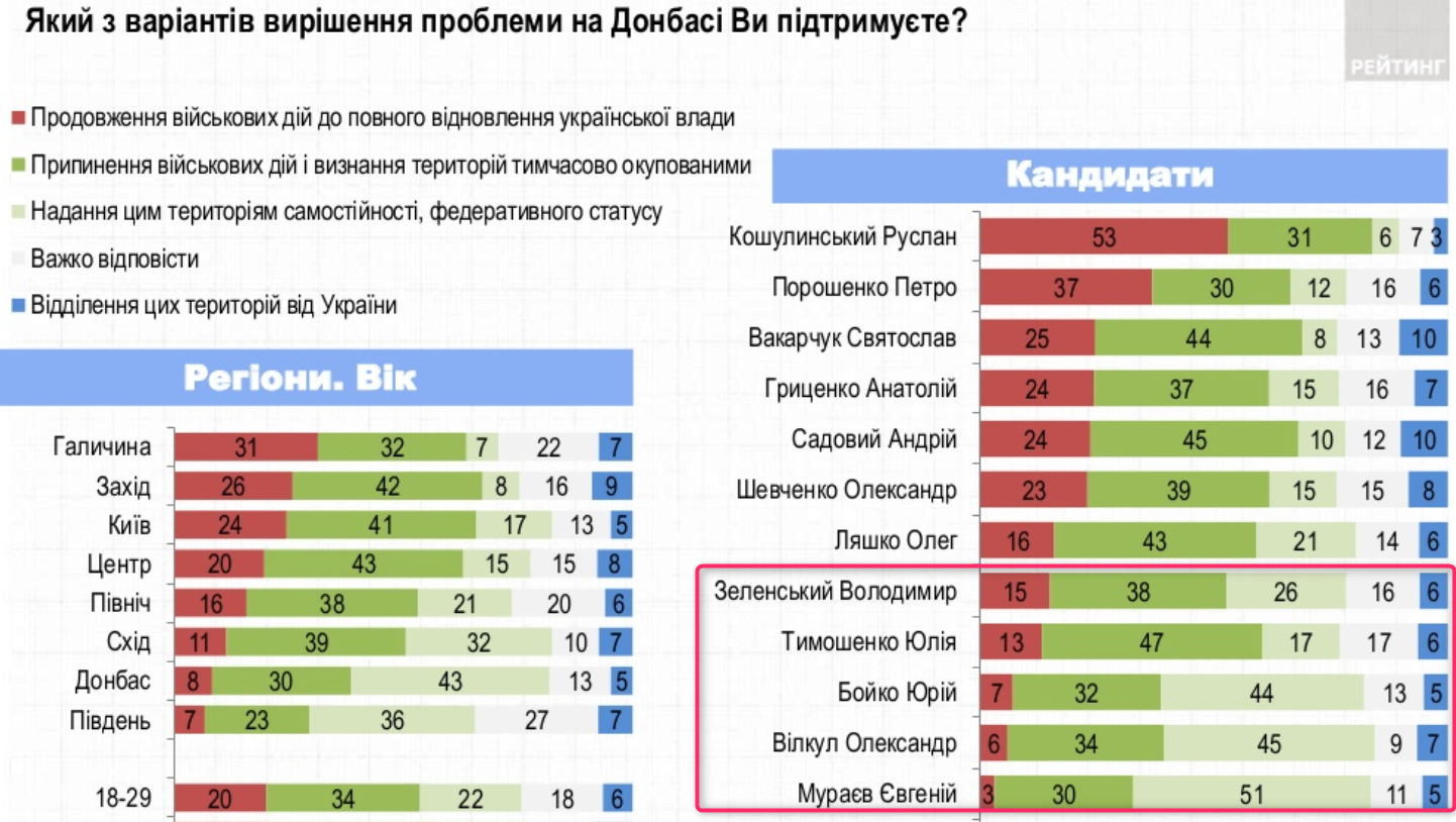 Социологический крен Зеленского в сторону Юго-Востока виден и по тому, как его избиратели видят решение проблемы Донбасса. 26% говорят, что этим территориям нужно дать федеративный статус, а 37% – что нужно остановить военные действия и признать эти территории временно оккупированными.