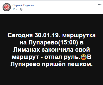 "Сегодня 30.01.19. маршрутка на Лупарево (15:00) в Лиманах закончила свой маршрут - отпал руль. В Лупарево пришел пешком", - пишет очевидец.