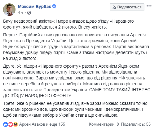 Также нардеп отметил, что "все лидеры "Народного фронта" вместе с Арсением Яценюком чувствуют важность момента и своего решения". Бурбак допустил, что решение "Народного фронта" по Яценюку может повлиять на ход и результат президентских выборов в Украине.