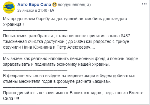 "Попытаемся разобраться, стала ли после принятия закона 8487 таможенная очистка доступной (до 500 евро), как радостно с трибун озвучили Нина Южанина и Петр Алексеевич Порошенко. Мы знаем, как реально наполнить пенсионный фонд и помочь людям зарабатывать и поднимать экономику нашей Украины. В феврале мы снова выйдем на мирные акции и будем добиваться отмены множителя годов в формуле расчета "акциза", - отмечается в сообщении.