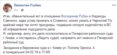 "Итак, обвинительный акт Владимира Рубана и Надежды Савченко, едва успев приехать в Славянск, может выехать в Чернигов! По крайней мере так хотят прокуроры, которые подали сегодня ходатайство в ВС об определении подсудности дела", - написал адвокат, на своей официальной странице в соцсети Фейсбук в четверг вечером.