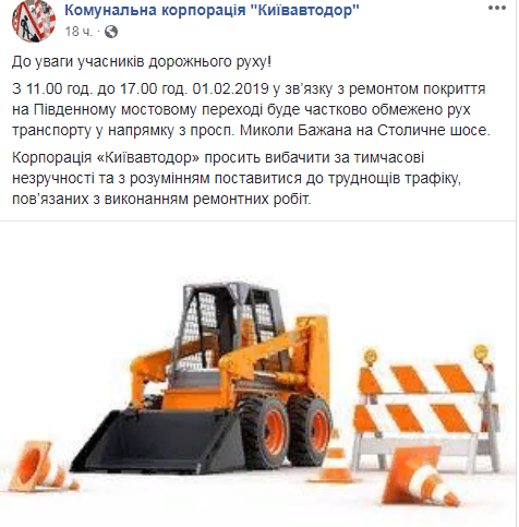 "С 11:00 часов до 17:00 часов 01.02.2019 в связи с ремонтом покрытия на Южном мостовом переходе будет частично ограничено движение транспорта в направлении с пр-та Николая Бажана на Столичное шоссе", - сказано в сообщении.