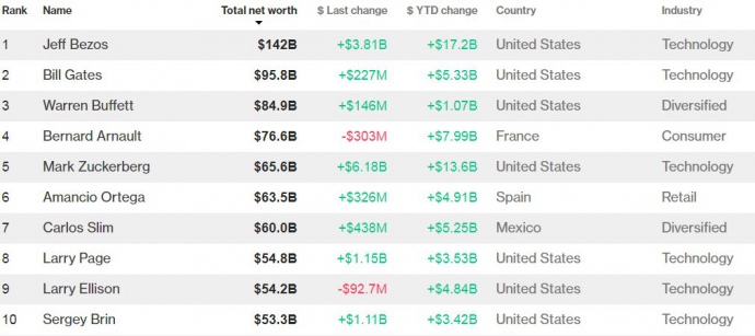 Лидером топа самых богатых людей мира является глава Amazon и Blue Origin Джефф Безос - его состояние превышает 140 млрд долларов.
