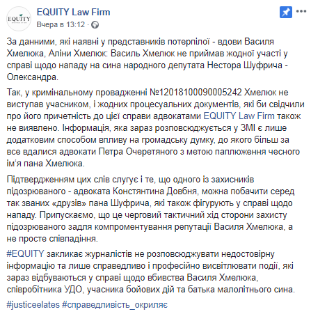 Адвокаты юридической фирмы Equity, которые представляют интересы вдовы убитого сотрудника Управления государственной охраны Василия Хмелюка Алины, опровергают участие погибшего в нападении на сына нардепа Нестора Шуфрича Александра. Об этом идет речь в заявлении, опубликованном на странице юристов в Facebook.