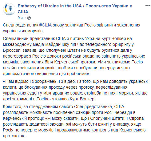 Волкер добавил, что в Вашингтоне обладают полной информацией о ситуации в районе Керченского пролива.