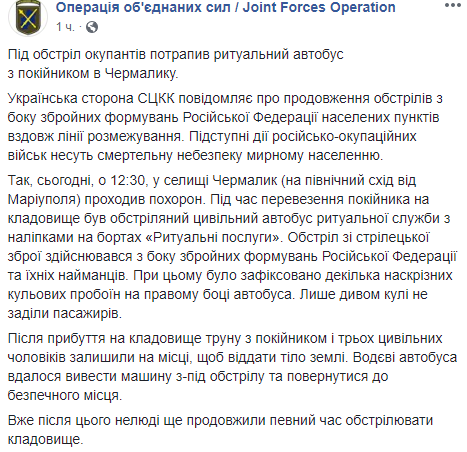 "Сегодня в 12:30 в поселке Чермалык (на северо-восток от Мариуполя) проходили похороны. При перевозке покойника на кладбище был обстрелян гражданский автобус ритуальной службы с наклейками на бортах "Ритуальные услуги". Обстрел из стрелкового оружия осуществлялся со стороны вооруженных формирований Российской Федерации и их наемников", - говорится в сообщении украинской стороны Совместного центра по координации и контролю сторон.
