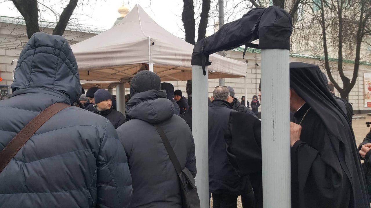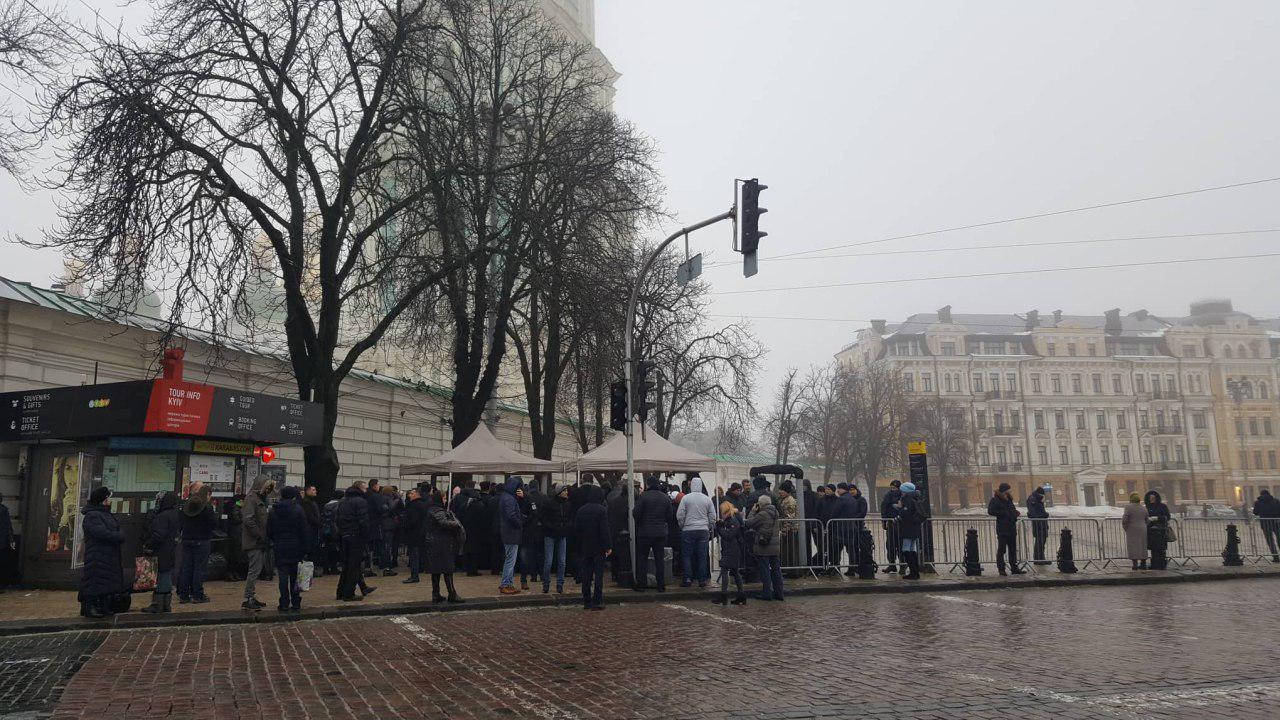 Церемония проходит на литургии в Соборе Святой Софии Киевской. На площадке перед храмом собрались полицейские, представители Нацгвардии, которые охраняют общественный порядок.