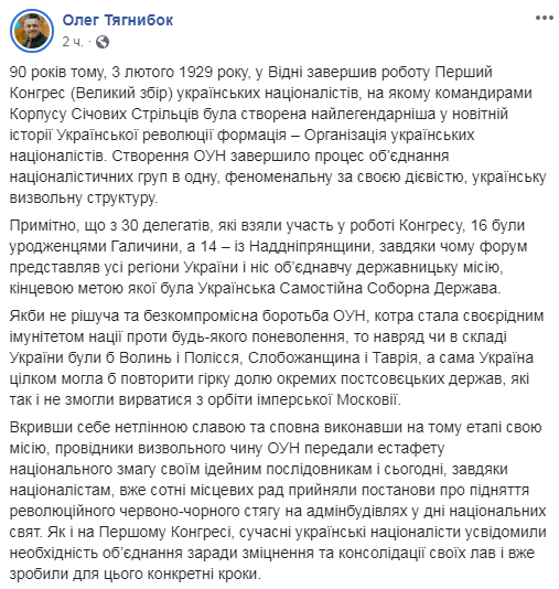 Тягнибок же решил напомнить, что большинство участников Первого конгресса украинских националистов были уроженцами Галичины. Меньшинство членов были из Надднепрянщины. При этом Тягнибок заявил, что "форум представлял все регионы Украины".