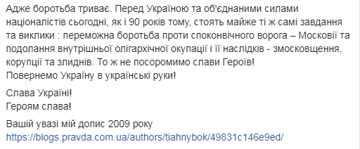 "Порошенко или Вилкулу кажется, что стоит здороваться "Слава Украине" или попеть "Зродились ми великої години...", и ты уже почти оуновец. Это не так, для борцов 20-40-х, гимн и приветствия были олицетворением в словах их идеализма, борьбы и реальных дел. Они гордо говорили: "Слава Украине", потому что были готовы отдать ей все, даже жизнь, а не украсть у нее все", - указано в опубликованном сообщении.